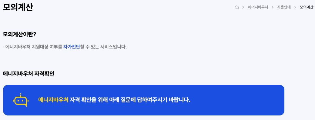 Q: 대상자인지 아닌지 헷갈려요 에너지바우처 사이트에서 모의계산을 통해 확인해 볼수 있습니다.