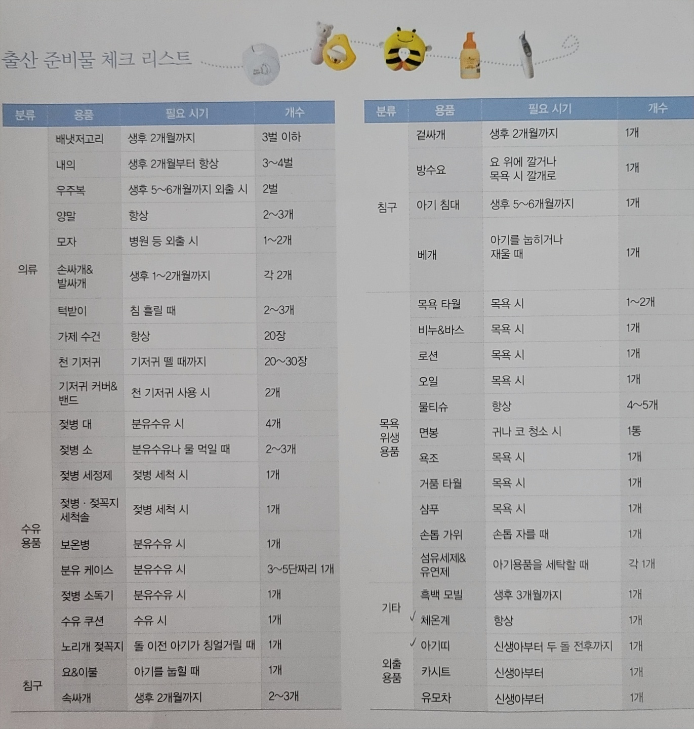 출산 전 출산 준비물 리스트에 목록과 수량을 꼼꼼히 작성해야 필요한 용품을 빠뜨리지 않을 수 있고, 또 불필요한 물건을 살일이 없다. 직접 리스트를 작성해도 되고 육아용품점 , 육아관련 사이트, 카페 등에서 다운받아 사용할 수도 있다.